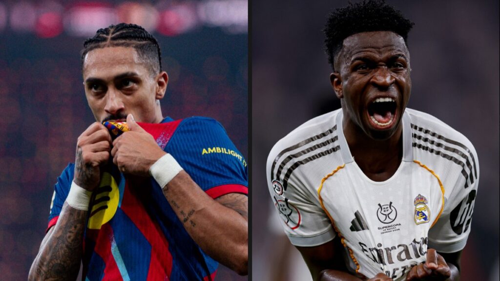 O primeiro gol do jogo foi marcado por Raphinha, que invadiu a área e chutou cruzado no canto de Courtois. O Real Madrid empatou com um gol de Vinícius Júnior, que fez uma jogada individual pela esquerda e chutou cruzado para mudar o placar.