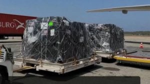O material desembarcou no Aeroporto Internacional Simón Bolívar, em La Guaira, e foi recebido pelo representante diplomático venezuelano nos EUA, Félix Plasencia, e pela encarregada de negócios americana, Laura Dogu. Autoridades dos EUA informaram que este é o primeiro de vários carregamentos que devem chegar em breve, visando fortalecer o sistema de saúde venezuelano.