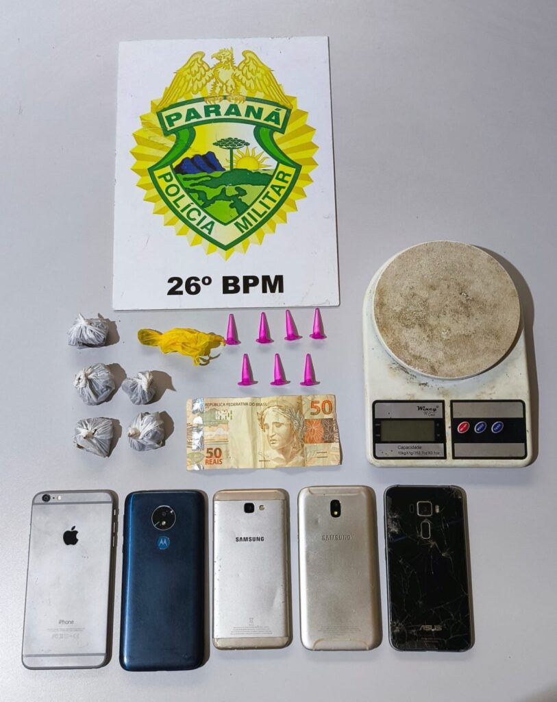 Equipe da Polícia Militar do Paraná prendeu um homem por tráfico de drogas no bairro José Lacerda, em Reserva. Durante diligências, foram encontradas substâncias análogas, aparelhos celulares, sementes e equipamentos usados para fracionamento de entorpecentes.
